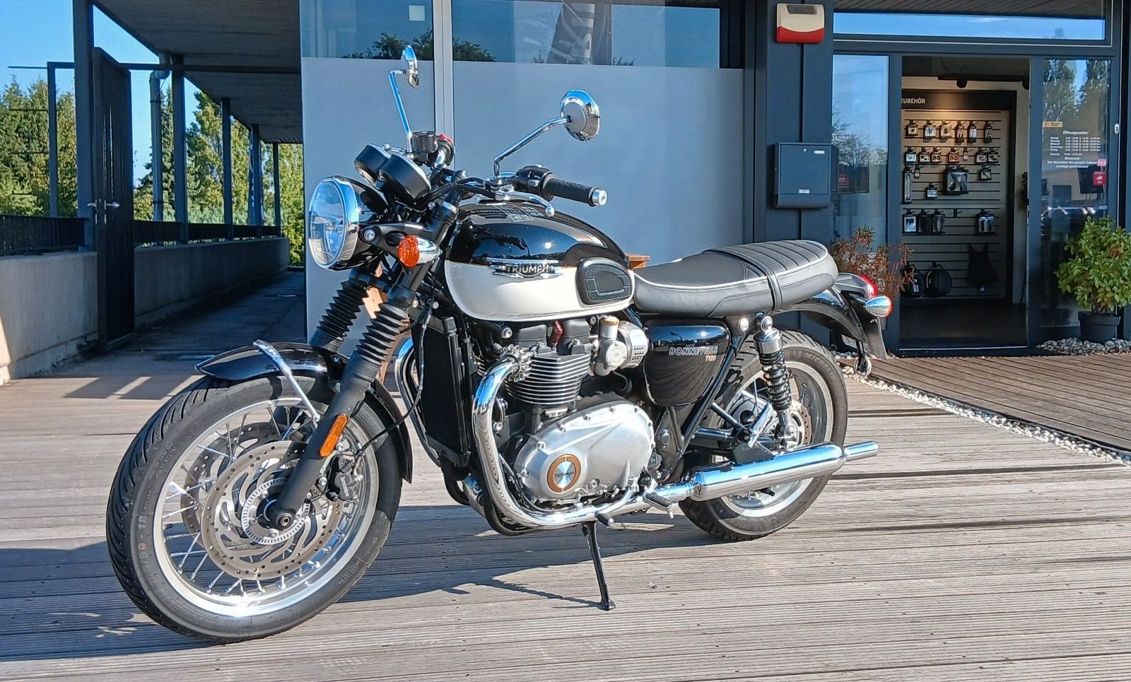 Auf ca. 1.500 qm Ausstellungsraum mit Fachwerkstatt bieten wir ihnen die komplette Modellpalette von Triumph und Honda Neufahrzeugen, sowie immer eine Auswahl an gebrauchten Fahrzeugen aller Marken. Desweiteren stellen wir einen Großteil des Original Triumph und Honda Bekleidungssortiment aus und bieten diverse Accessories für viele Modelle in der Ausstellung.