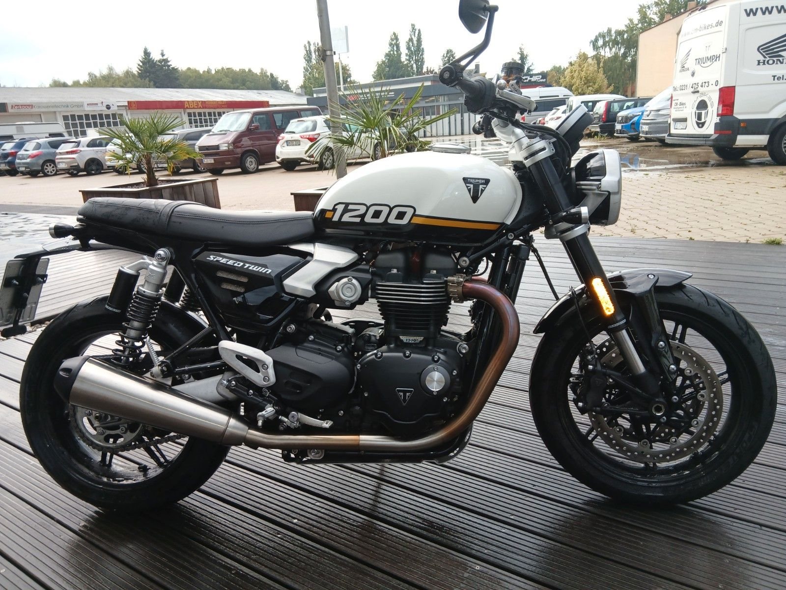 Mit den neuen Speed Twin 1200-Modellen bietet Triumph zwei außergewöhnliche Maschinen, die Retro-Optik und moderne Technik ansprechend kombinieren. Der potente 1200er Paralleltwin trifft nun auf State-of-the-Art Elektronik.und verwöhnt mit einem herrlichen Sound. Die Standard-Speed Twin überzeugt mit einer entspannten Ergonomie. Der breite, höher positionierte Lenker und die niedrigeren Fußrasten sorgen für eine aufrechte Sitzhaltung. Auf der Standardvariante sind alltagstaugliche Fahrwerks- und Bremskomponenten verbaut, die in den meisten Situationen vollkommen ausreichen.