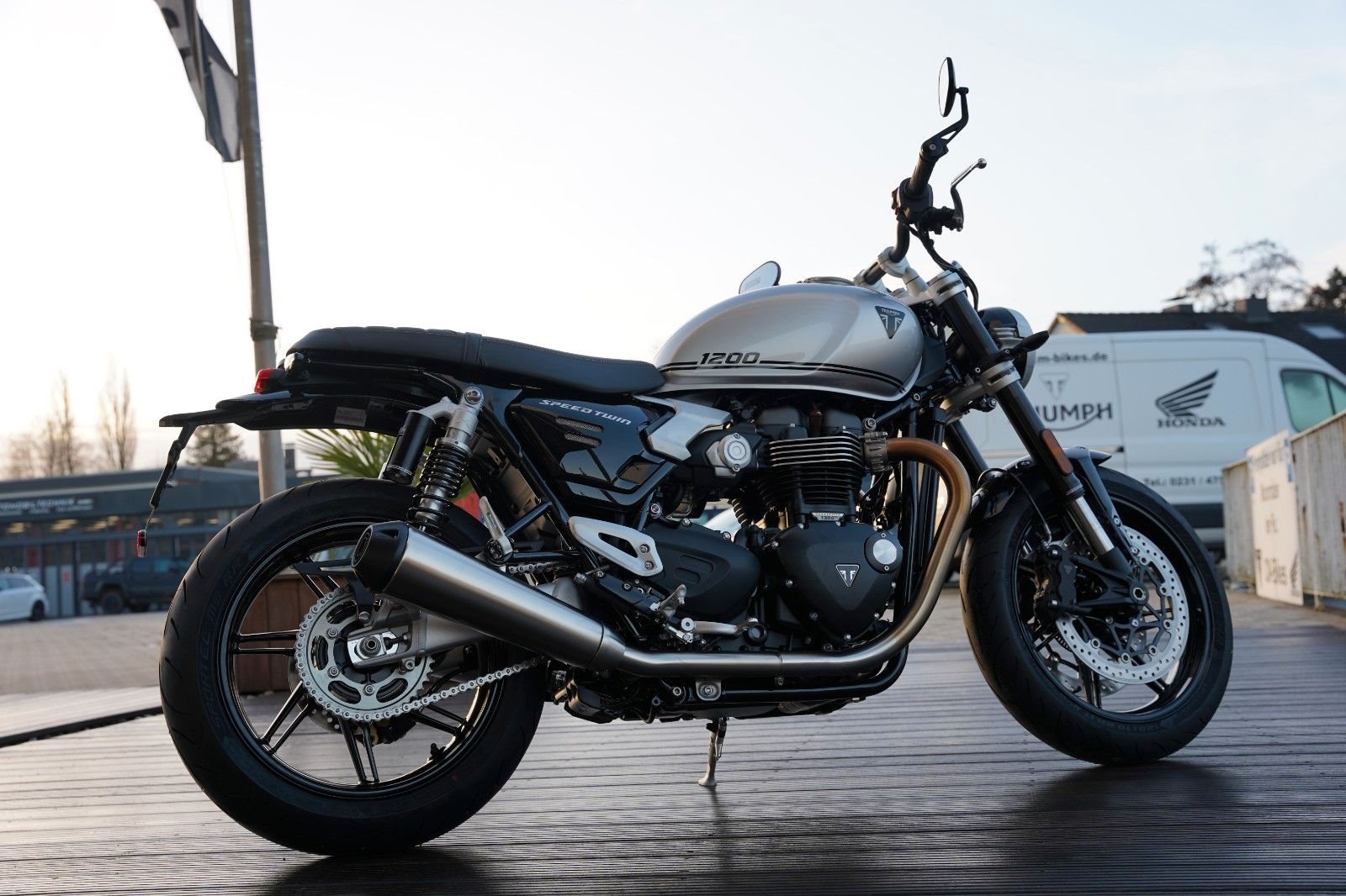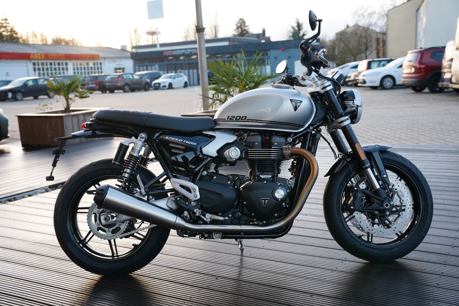 Mit den neuen Speed Twin 1200-Modellen bietet Triumph zwei außergewöhnliche Maschinen, die Retro-Optik und moderne Technik ansprechend kombinieren. Der potente 1200er Paralleltwin trifft nun auf State-of-the-Art Elektronik.und verwöhnt mit einem herrlichen Sound. Die Standard-Speed Twin überzeugt mit einer entspannten Ergonomie. Der breite, höher positionierte Lenker und die niedrigeren Fußrasten sorgen für eine aufrechte Sitzhaltung. Auf der Standardvariante sind alltagstaugliche Fahrwerks- und Bremskomponenten verbaut, die in den meisten Situationen vollkommen ausreichen.